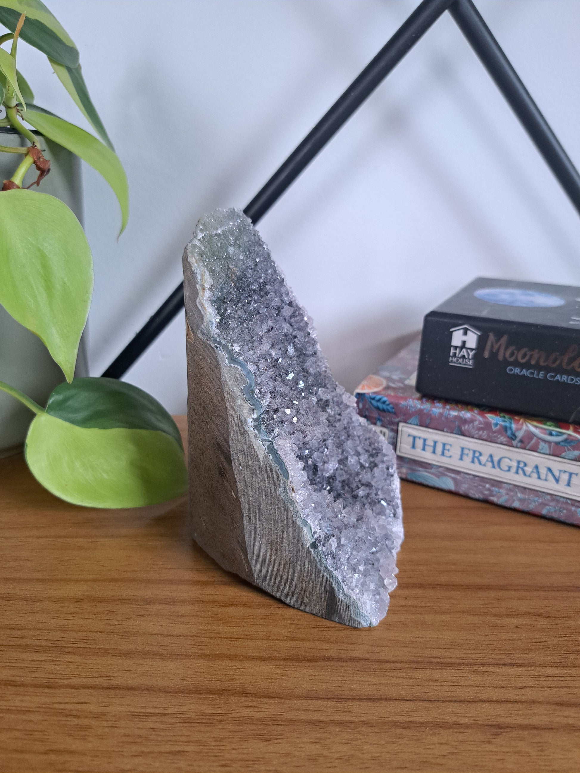 This stunning freeform piece showcases deep purple hues and a small inclusion of black Amethyst at the top. With its unique druzy texture, this statement piece is sure to add a touch of elegance to any space.