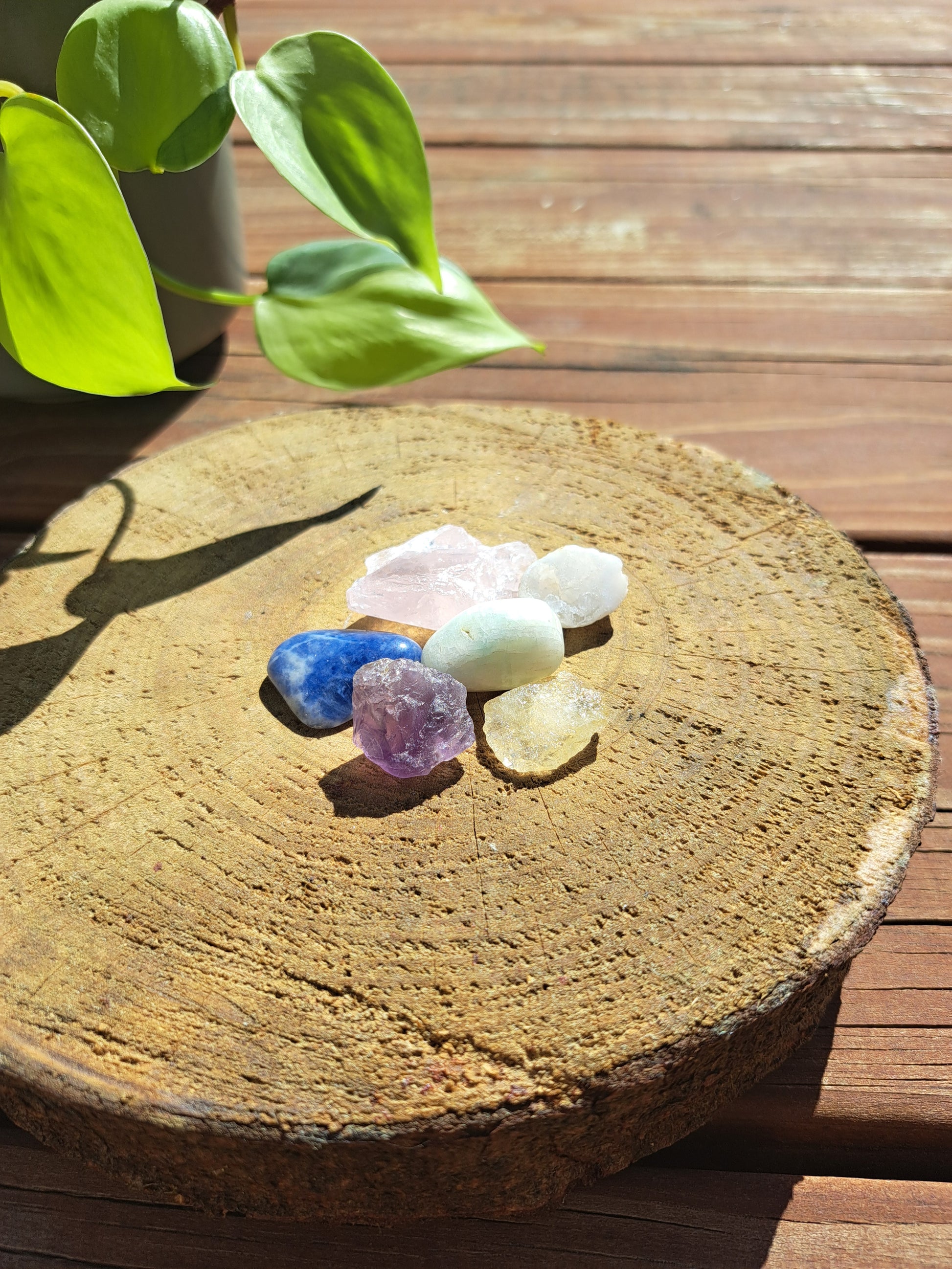 This bundle includes: Raw rose quartz, amethyst, quartz, and citrine. Tumbled sodalite and amazonite