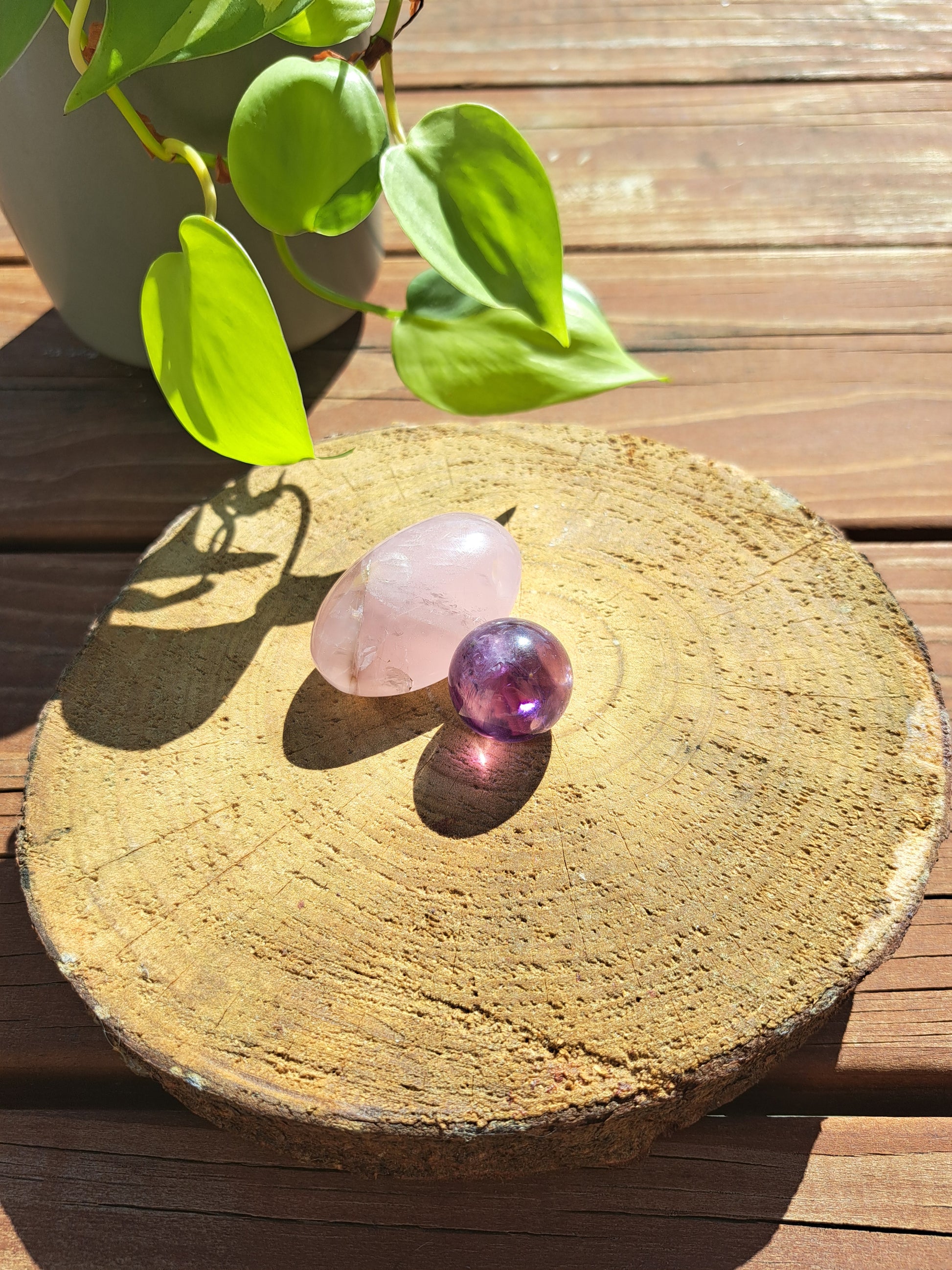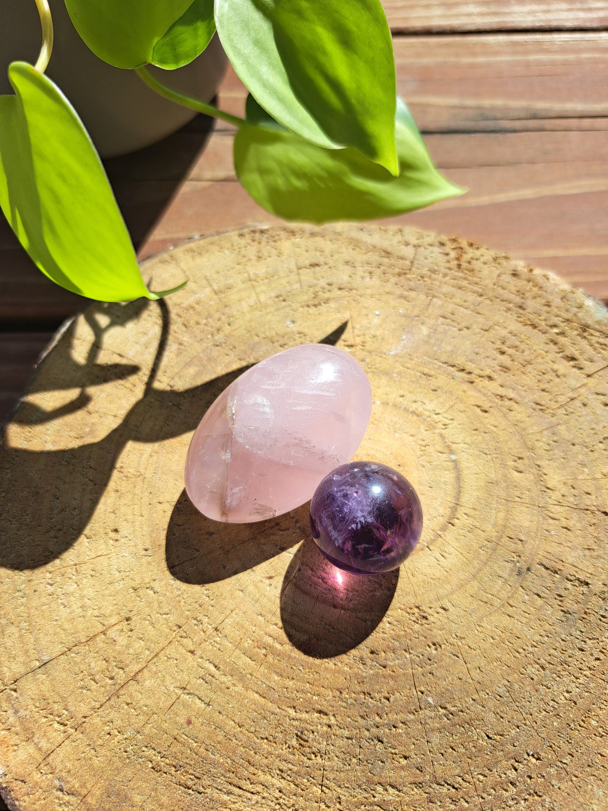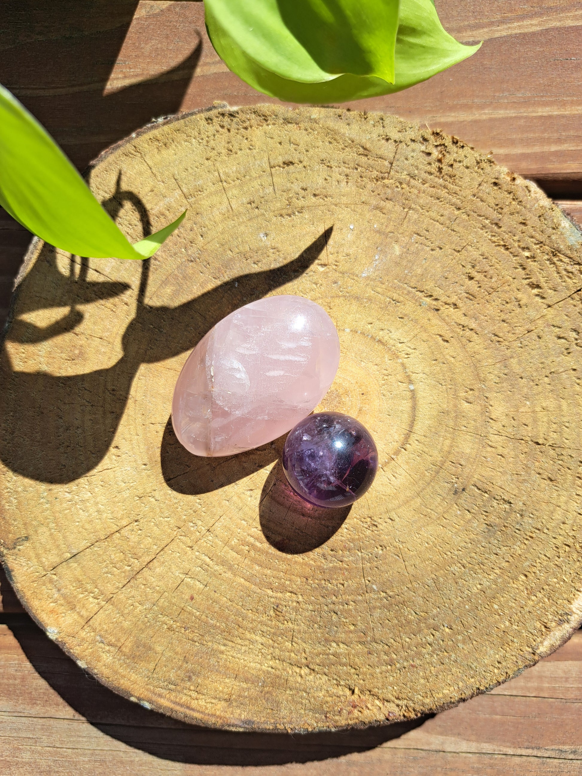 This bundle includes: Amethyst sphere and rose quartz palm stone